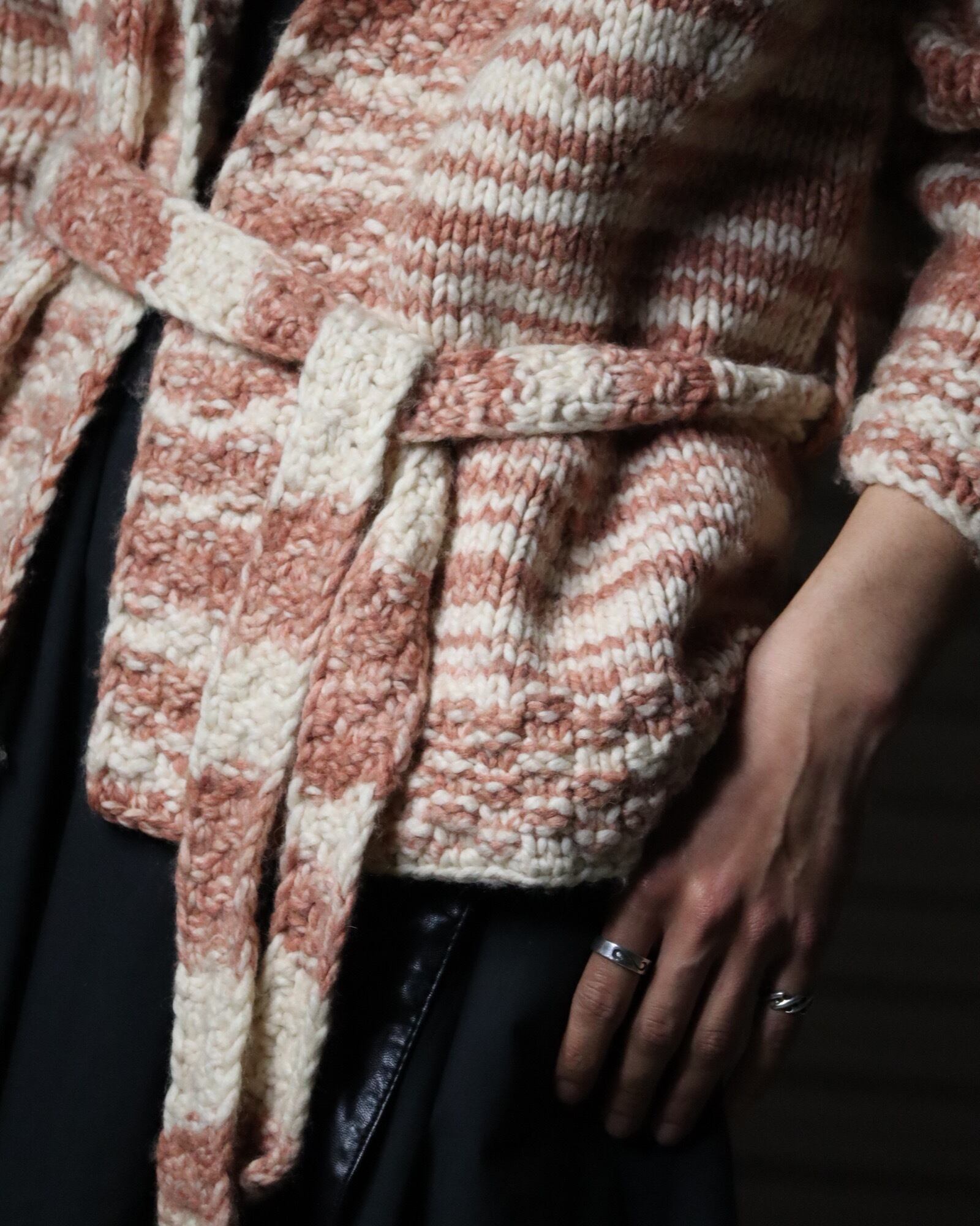 ▼Item / melange × stripes belted chunky knit cardigan