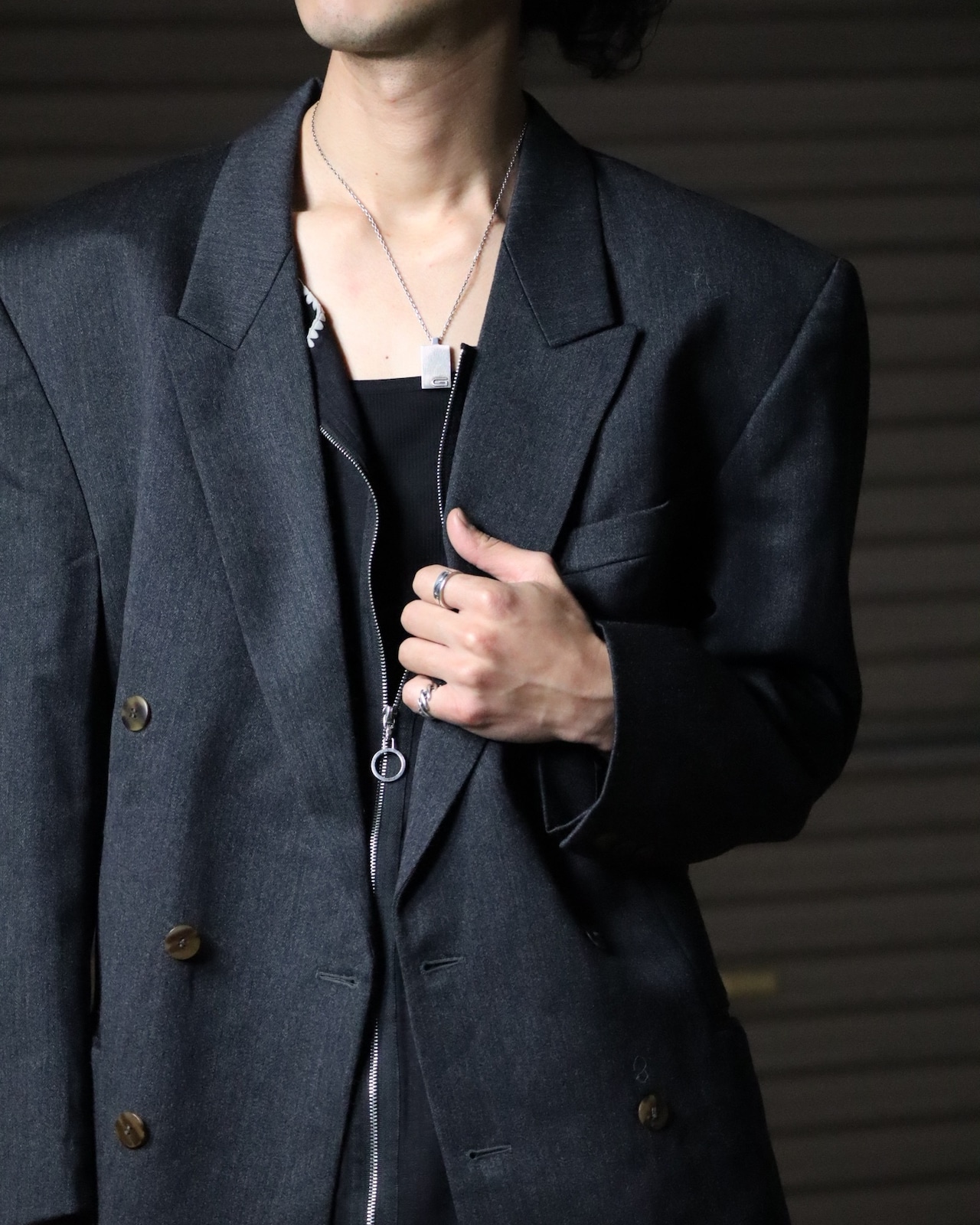 ▽Detail / ダブルブレステッド、ピークドドラペル、ノーベント