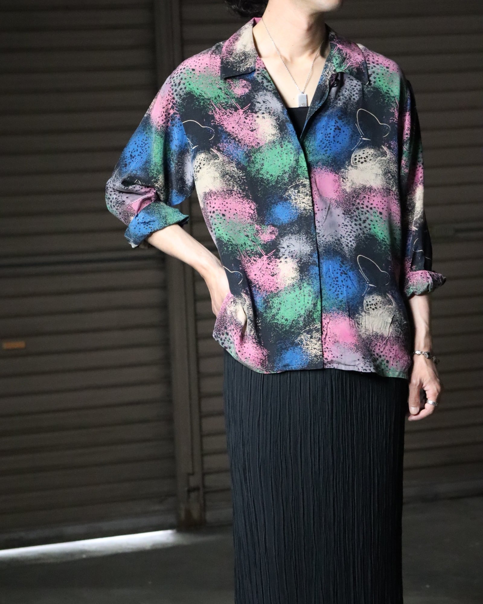 ▼Item / butterfly × marble art silk l/s shirt fly front