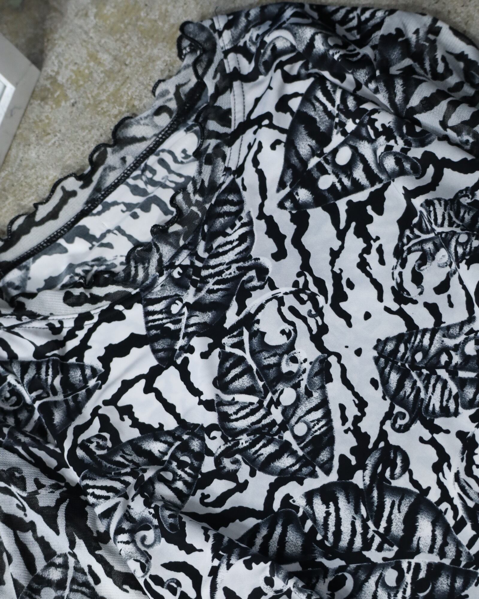 ▽Detail / シアーメッシュスリーブ、フリル、ラウンドネック