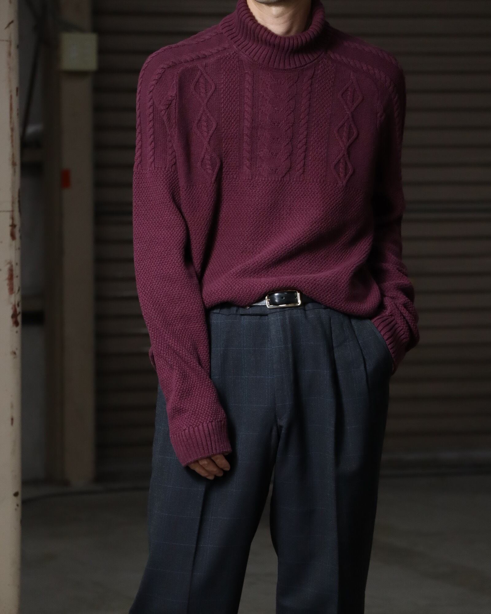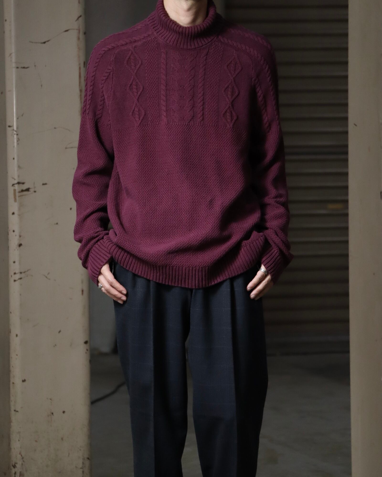▼Item / turtleneck × raglan sleeve cotton cable knit sweater