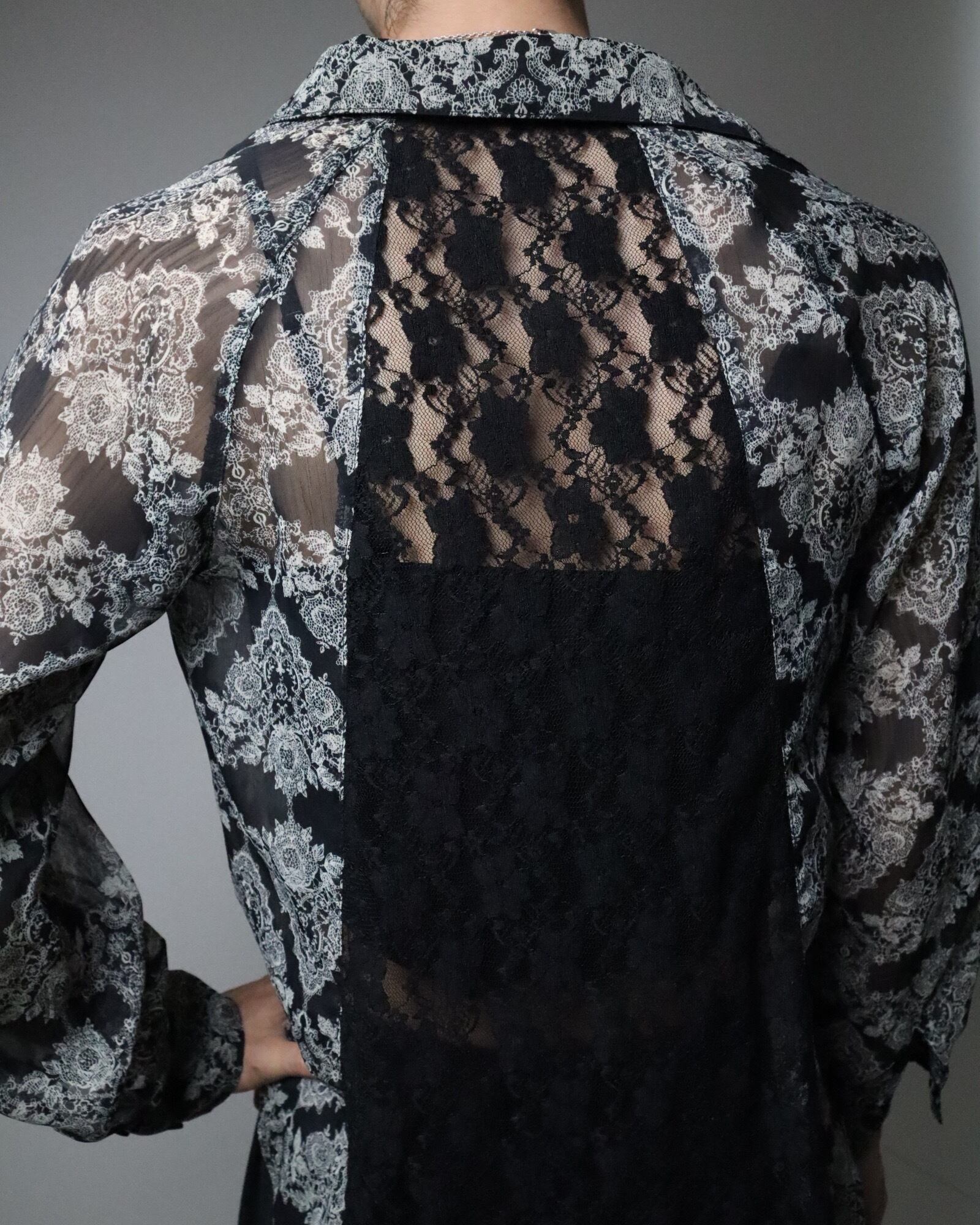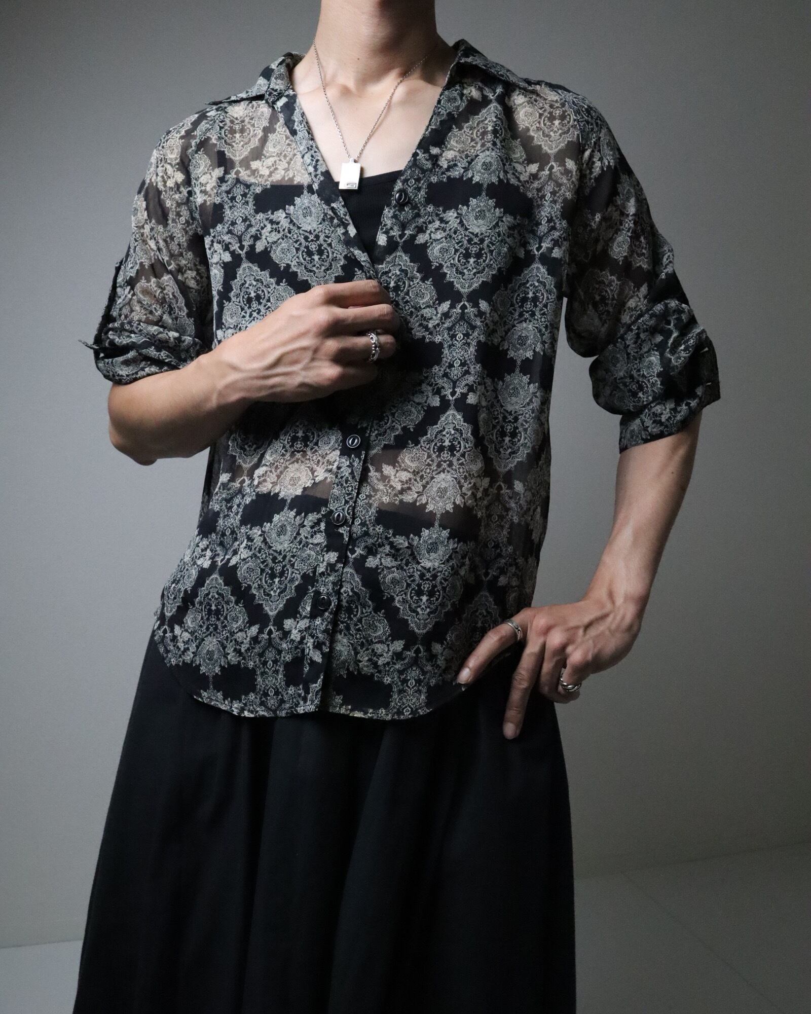 ▼Item / damask pattern lace mesh switching sheer L/S shirt black