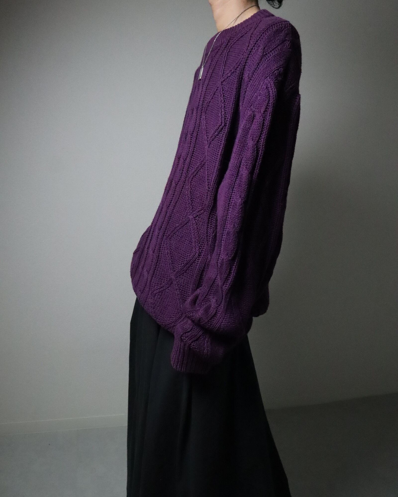 ▽Detail / クルーネック、ケーブル編み、袖・裾リブ